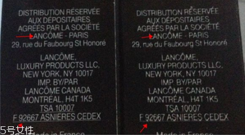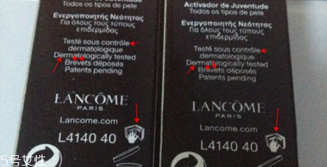 小黑瓶小樣真假對比比較明顯的另外一處是盒子側(cè)面的LANCOME和下劃線最后一行的位置,正品印刷的字體都清晰,沒有拖泥帶水的粗線條。而假的小黑瓶小樣,字體上則有很多拖泥帶水的地方,另外下劃線部位也已經(jīng)與字體連接起來了。而正品的下劃線則完全沒有和字體相連接。