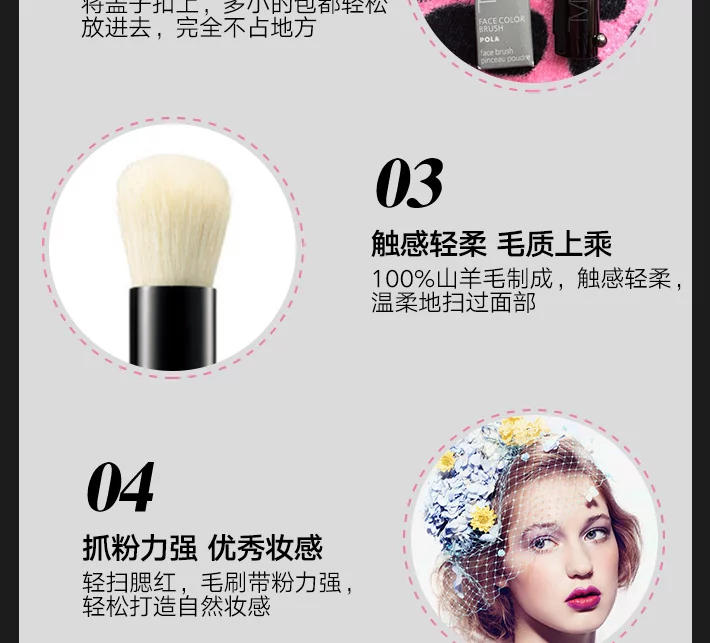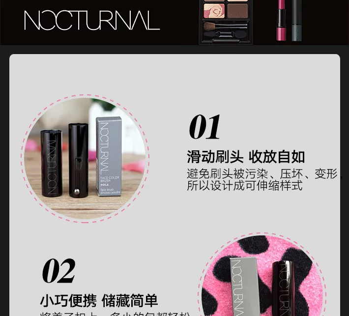 POLA ?NOCTURNAL 攜帯便攜用腮紅刷 100%山羊毛。創(chuàng)意理念---黑夜中盛開的花、不刻意、但能細致刻上美人印象的意思。由當(dāng)代藝術(shù)作家宮山香里氏的“有透明感立體技法”設(shè)計開發(fā)。細致的控光粉體技術(shù)、和保濕護膚成分配合、再加上高透明感粉體。重疊會產(chǎn)生更自然美層次、簡単刷出立體感設(shè)計。高級山羊毛制作。毛質(zhì)柔軟,收放自如,小巧精致,攜帶便利。