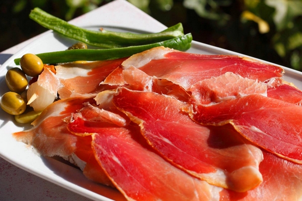 西班牙火腿非常有名,其產(chǎn)量與消費(fèi)量一直是全球第一,而其火腿制作和食用的歷史更是非常悠久,早在千年以前的羅馬時(shí)代,利比里亞半島的人們就已經(jīng)開始制作和食用火腿了。在西班牙,火腿普及率很高,食用方式非常多樣,生吃、烹調(diào)皆可。火腿種類也相當(dāng)齊全,每間稍微有那么點(diǎn)兒講究的西餐廳,都有西班牙火腿供應(yīng)。黑蹄豬、賽拉諾、橡果……一大堆不明覺厲的名稱足以把人晃暈。但其中最鼎鼎大名的,當(dāng)屬在《風(fēng)味人間》中出過場(chǎng)的伊比利亞火腿。市面上伊比利亞火腿只占10%,只有用橡果喂養(yǎng)的伊比利亞黑豬后腿才能制作出頂級(jí)的伊比利亞火腿。伊比利亞火腿僅以粗海鹽調(diào)味,不加任何添加劑或化學(xué)成分,火腿需要經(jīng)歷長(zhǎng)達(dá)20個(gè)月以上的窖藏腌制才能進(jìn)行售賣。切割下來的每一片伊比利亞火腿,都肉質(zhì)鮮滑,咸味適中,與同樣需時(shí)間釀造的紅酒是天生絕配。