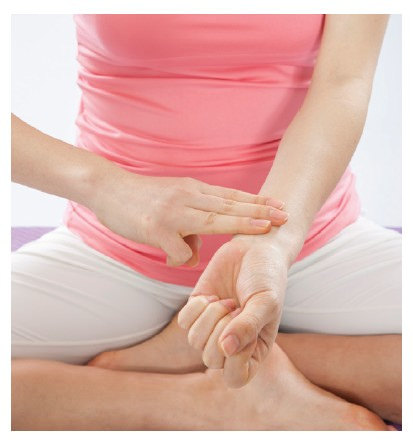 1 將食指、中指、無名指并排放在手腕內(nèi)側(cè)。
