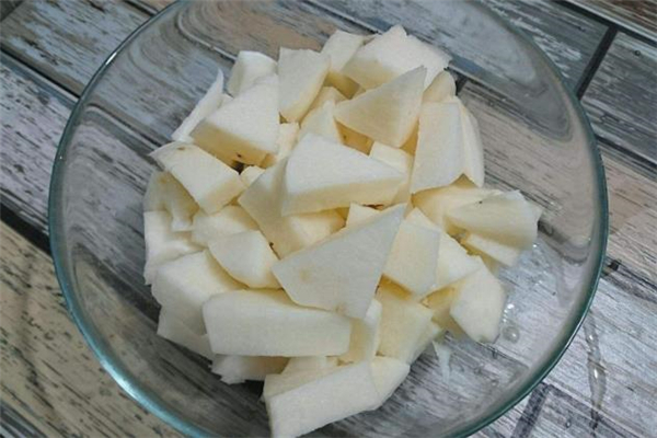 1首先我們將涼薯清洗干凈之后,將它的外皮削掉,之后再將它切成均勻的薄片狀,放入清水中沖洗一段時(shí)間。